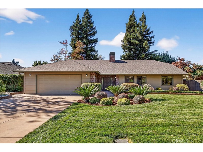 Beautifully cared for home in a desirable cul-de-sac within the peaceful Walnut Woods Subdivision. Immediately you notice the beautifully landscaped front yard and space for parking. As you enter the home you find that the family room has a wood fireplace and a stunning arched and beamed wooded ceiling. The skylights, French doors and large windows provide ample natural light. From both the Family room and dining area you look out to a gorgeous and maturely landscaped backyard haven. Also in the family room you will find a built-in storage bookshelf, with a bench seat. The kitchen has some updated touches with newer counter tops, a gas range, and an eating bar. The primary bedroom suite also has a arched ceiling, generous walk-in closet and access to the backyard. Sitting on your back patio is pure joy! From the thick, dark green lawn, to the beautiful bushes and amazing mature trees, it is incredibly peaceful and also a fantastic place for gatherings and fun. Love to garden? There is plenty of space and the awesome west Chico soil. This home has custom built characteristics, is spacious yet feels tremendously cozy. The HVAC system was replaced in 2024, there is a septic and pest clearance and the brand new roof and fresh interior paint throughout, create the perfect shell and canvas to make this home your own. Make an appointment with your favorite Realtor today and come see the possibilities.