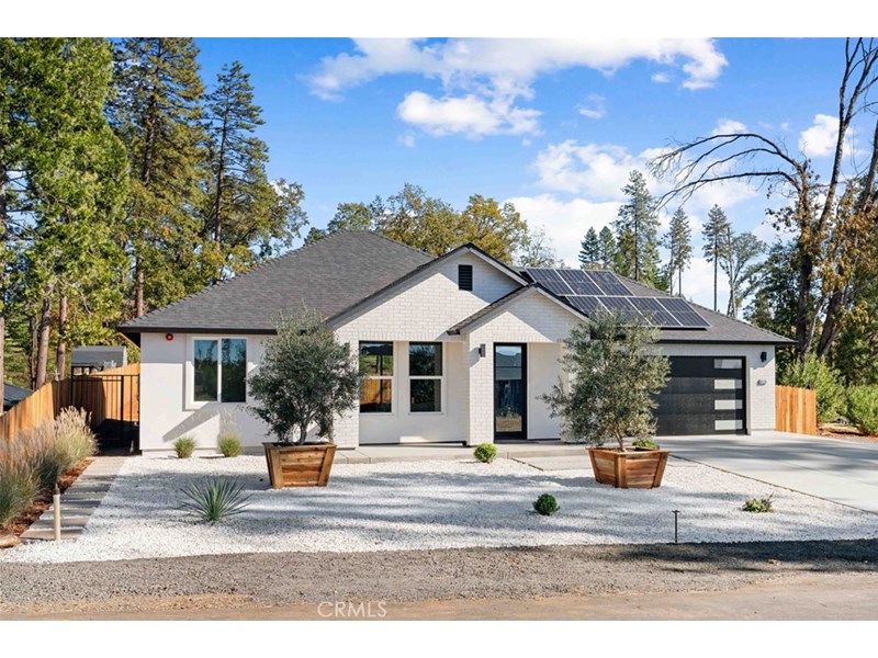 New construction in a highly desirable Paradise location! This exceptional home is truly one of a kind, featuring too many upgrades to list, built with attention to every detail, and designed to stand apart from anything else on the market. The exterior impresses with a custom stucco finish, a covered paved front porch, tall roofline, and a custom walkway leading to a sleek glass-and-steel entry door, framed by Milgard windows. Durable thick rebar-reinforced concrete patios and driveway, an insulated garage door, and abundant exterior lighting complete the striking curb appeal. Inside, the open-concept layout showcases laminate flooring, ceiling fans in every room, and imperfect smooth textured walls that add warmth and depth. The gourmet kitchen is a showpiece, featuring elegant Taj Mahal quartzite countertops, a large matching island, soft-close modern wood cabinetry, and Delta/Kohler fixtures, including provisions for direct microwave hookup. Bathrooms mirror the same luxurious finishes with granite slab shower walls, Taj Mahal vanities, soft-close cabinetry, and Delta faucets. Additional highlights include a laundry room with sink, custom built-in closets, and a stunning accent granite electric fireplace with blow heat. The outdoor spaces are designed for entertaining and relaxation, featuring a large covered paved patio, outdoor kitchen with hot water, and a flat, usable almost half-acre lot with RV access gates. The front yard is beautifully landscaped with automatic irrigation, pre-built for expansion. Owned solar adds energy efficiency, while proximity to shopping and a nearby creek enhances the lifestyle. With its abundance of upgrades, unique design, and resort-like details, this home perfectly blends luxury and functionality, a rare opportunity in Paradise, California.