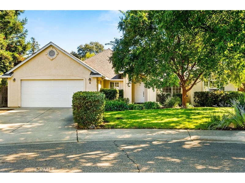End-of-Cul-de-Sac Gem with LARGE BACK YARD & OWNED SOLAR! Tucked away at the end of a quiet cul-de-sac is this beautiful 3-bedroom, 2-bath plus it has an office/playroom/bonus room! The home features a desirable split floor plan with a spacious open layout, perfect for everyday living and entertaining. As you step inside, you’ll immediately notice the laminate wood floors that flow seamlessly throughout. Just off the entryway, a versatile bonus room provides the perfect setting for an office, playroom, or creative studio. The main living area is open and airy, highlighted by vaulted ceilings and a cozy gas fireplace that sets the tone for relaxing evenings. The kitchen is thoughtfully designed with the home chef in mind, featuring beautiful granite countertops, ample cabinet storage, a gas range, and double ovens—ideal for preparing family meals or hosting dinner parties. The private primary suite is located just off the kitchen and offers a true retreat from the rest of the home. You’ll love the coffered ceiling detail, the HUGE walk-in closet, and the private sliding door that opens directly to the backyard. The primary bathroom feels like a spa with a dual-sink vanity, walk-in shower, and a luxurious jacuzzi tub that invites you to unwind after a long day. On the opposite end of the home, two guest bedrooms and a full guest bath provide additional comfort and privacy for family or visitors. Step outside and prepare to be impressed by the HUGE backyard—an outdoor oasis designed for both relaxation and play. The cedar pergola creates a perfect spot for outdoor dining and gatherings with friends and family. Concrete walkways and flagstone accents lead you through multiple patio areas ideal for fire pits, lounge seating, or morning coffee under the trees. The landscape offers something for every season with a stunning redwood tree providing shade, a Japanese maple for a touch of zen, and crepe myrtles, dogwood, and jasmine adding color and fragrance. Fruit lovers will appreciate the pomegranate and Meyer lemon trees, along with thornless blackberries ready for summer harvests. Raised garden beds await your next crop of vegetables or flowers, and a large storage shed provides plenty of space for tools and outdoor gear. With owned solar for energy efficiency, a quiet cul-de-sac location this home checks all the boxes. Don’t miss your chance to make this exceptional property your new home!